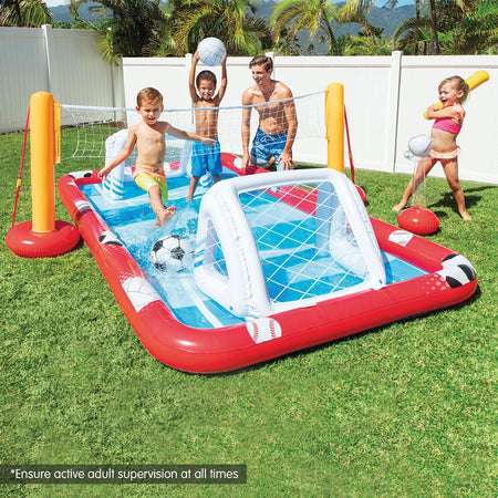 Spend hours playing together with the Intex Action Sports Play Centre! This inflatable playset lets you transform your backyard or garden into a mini sports arena. It comes with volleyball, soccer, and baseball equipment to encourage little athletes. With three balls included, this set makes for a great summer activity!