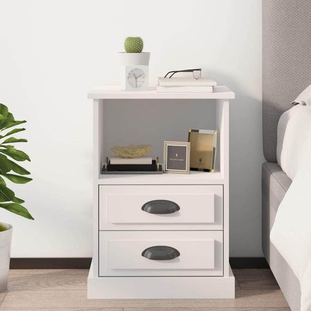 This bedside cabinet with an elegant design makes a timeless addition to your interior decor. Durable material: The engineered wood is of exceptional quality with smooth surface and also features strength, stability and resistance to moisture.Ample storage space: The bedside table is designed with 2 drawers and 1 open compartment to keep things organised and within easy reach.Stable and sturdy table top: The top of the side cabinet is perfect for displaying your decorative items, picture frames, and potted plants. Warning:To prevent it being overturned, this product must be used with the provided wall attachment device.