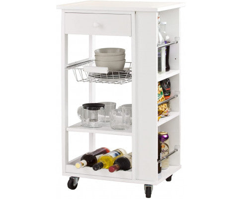 Features with a workbench, a drawer, a removable basket, a main shelf, a wine rack, 3 side shelves and 4 durable swivel castors.