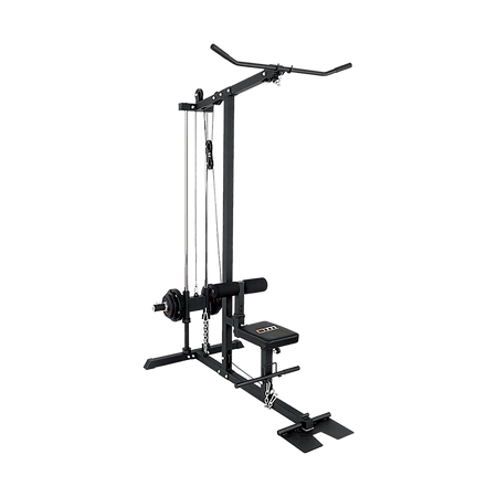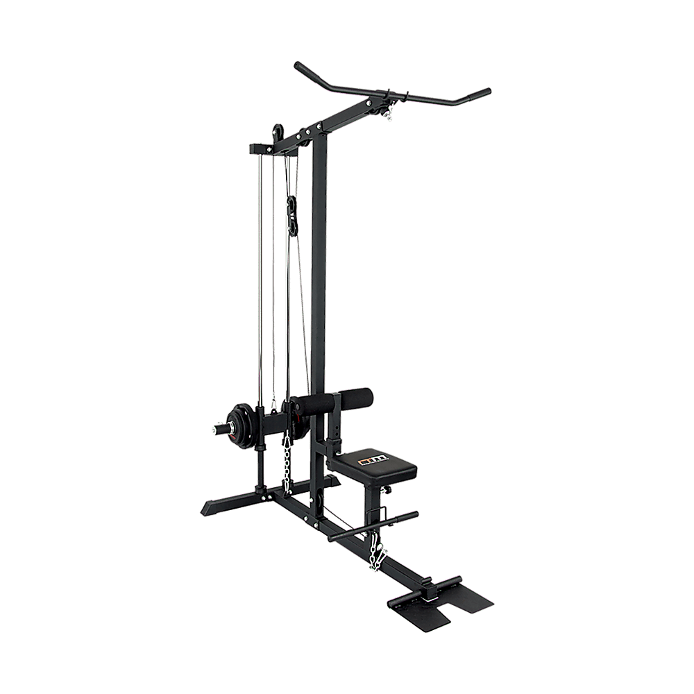 This new Fitness Plate Loaded Low Row / Lat Pull has a heavy duty steel construction. The solid unit has a dual guide rod system which provides the ultimate in safe, smooth and easy range of motion. The foot plate can be quickly flipped up in place for low rows. Lat Pull Down, Straight Row Bar and Standard and Olympic Weight Plate Adapters are included. Its no cable change design allows for easy adjustment from lat pull down to low rows.