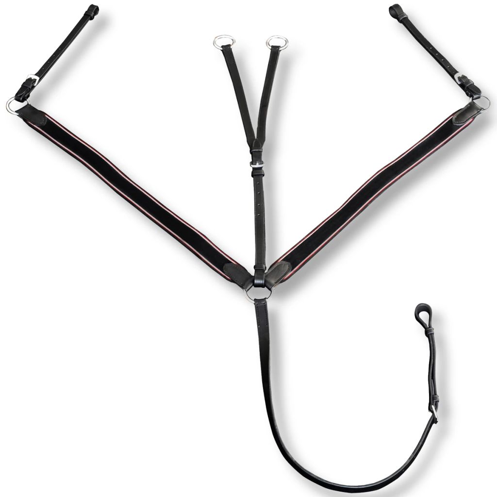 This leather elastic breastplate with running martingale attachment is a professional quality jumper breastplate for shows as well as everyday use. With adjustable neck straps, the length of the breastplate can be adjusted according to the size of your horse. The breastplate martingale is made of high-quality buffalo leather and has steel fittings, which give a classic look. The elastic minimises the restriction on your horse shoulders, but ensures that your saddle is stabilised properly.