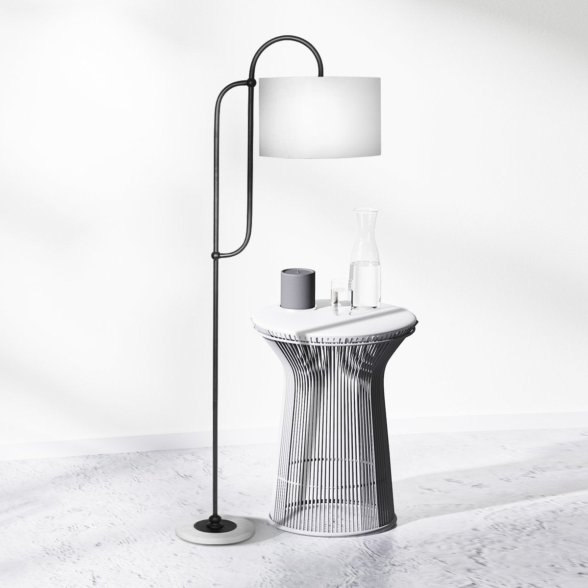 The curved post has a matte black finish and is weighted by a beautiful (and sturdy!) marble base. With a 100% cotton hardback drum shade, this piece will adorn your home for a long time.