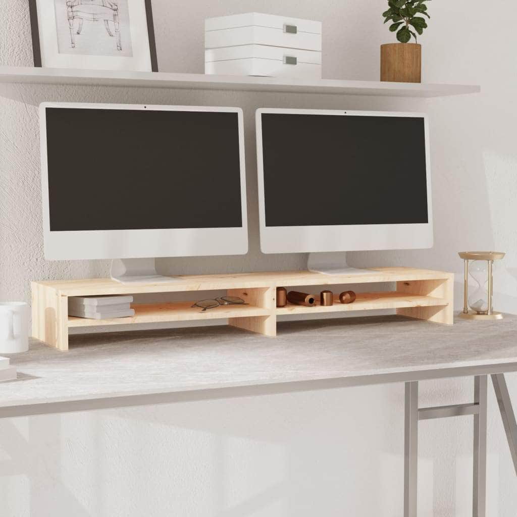 You can now raise your monitors higher with this monitor stand. The sleek design makes it a practical and decorative addition to your working area. Premium material: Solid pine wood is a beautiful natural material. Treat the surface with oil, wax, lacquer, or a glazing finish for a stronger surface and easy cleaning. Pine wood has a straight grain, and the knots give the material its signature, rustic look.Storage function: The storage shelves underneath can accommodate your keyboard, DVD player, gaming console, streaming device, receivers, media carriers, notebooks, pens, and similar items.Stress-reducing function: This wooden desk cabinet can be used as a riser for your desktop monitor and other multimedia devices. Raising your screen will reduce the strain on your neck and back.