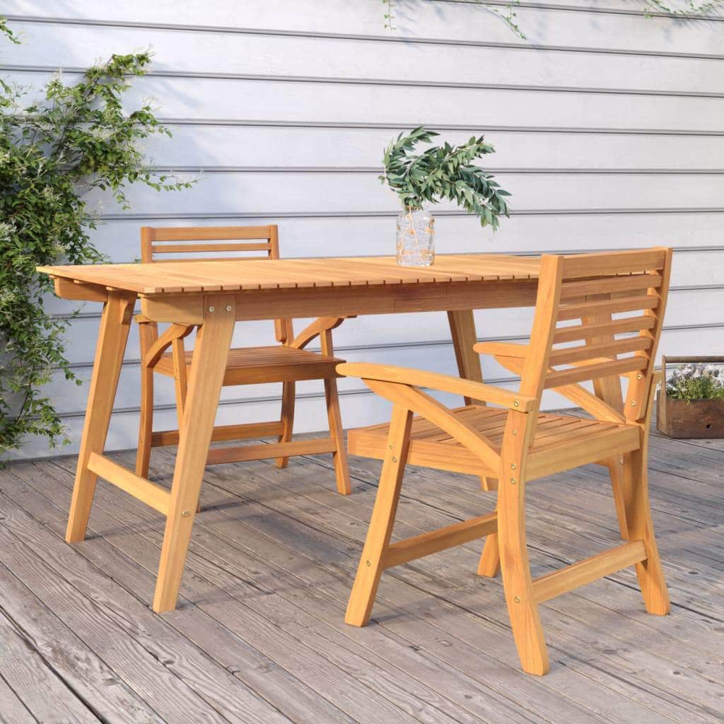 These classic wooden garden chairs are meant to be a real eye-catcher in your garden or patio. Solid acacia wood: The garden seating is made of solid acacia wood. Solid acacia wood is a beautiful natural material. Acacia wood is a tropical hardwood, which is dense, sturdy, and durable.Comfortable experience: The curved back and armrests of the outdoor chair ensure optimum comfort and relaxation.Slatted design: The patio chair, featuring a slatted design, makes a practical and decorative addition.Elegant legs: The curved legs of the outdoor seating create an air of elegance while ensuring stability. Good to know:To make assembly as easy as possible, each product is delivered with a manual. Note:To make sure your outdoor furniture stays beautiful, we recommend protecting it with a waterproof cover.