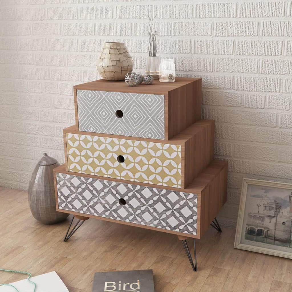 This bedside cabinet with 3 drawers has an understated but stylish design with elegant decorative patterns in different colours, and it can be used as a side cabinet. This bedside cabinet will make a practical as well as highly decorative addition to your bedroom, living area or lounge room. The rectangular tabletop is ideal for displaying decorative objects, photo frames, or even potted plants, while the three drawers provide ample space for keeping all kinds of smaller items organised and within reach. Thanks to the high-quality MDF material and the strong steel pin legs, this bedside cabinet is very sturdy and durable. Assembly is really easy.