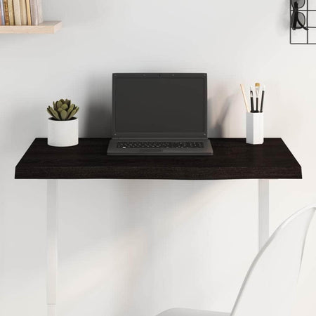 Give a new life to your table with this wooden table top. It is an excellent solution for freshening up your table at home or in a commercial setting. Solid oak wood: The tabletop is made of solid oak wood, which is a beautiful natural material. Oak wood has a medium brown colour and a dense grain, contributing to its unique look.Versatile applications: The replacement table top can be combined with different bases according to your needs.Treated surface: The replacement board has been treated with dark paint, so it is ready for use as an additional finish is not required.Handmade with live edge: The DIY board is meticulously handcrafted, showcasing a live edge that adds to its natural charm. Every piece of shelf has its own unique character to display. The delivery is random, ensuring the exclusivity and individuality of your product. Good to know:As a natural product, wood may show knots and imperfections that we fill with black fillings to ensure a smooth appearance.
