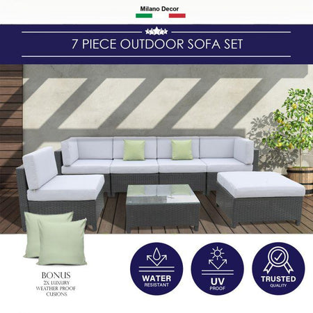 Experience contemporary living and functionality, with the 7-Piece Black and Grey Rattan Sofa Set designed by Milano! This Sofa Set has been designed with the outdoor space in mind and its 7-piece design allows for different configurations. Made from weather and UV-resistant PE Wicker Rattan with a sturdy and hidden Steel frame, it features plush foam seat cushions which are upholstered in waterproof, easy-to-clean polyester fabric. The cushions are also easily removable and easy to clean, to allow for both functionality during different seasons and for convenience. The coffee-table features a tempered glass table-top for peace of mind and the Sofa Set’s overall contemporary and minimalist design makes this conversation Sofa Set a perfect additional to any outdoor setting.