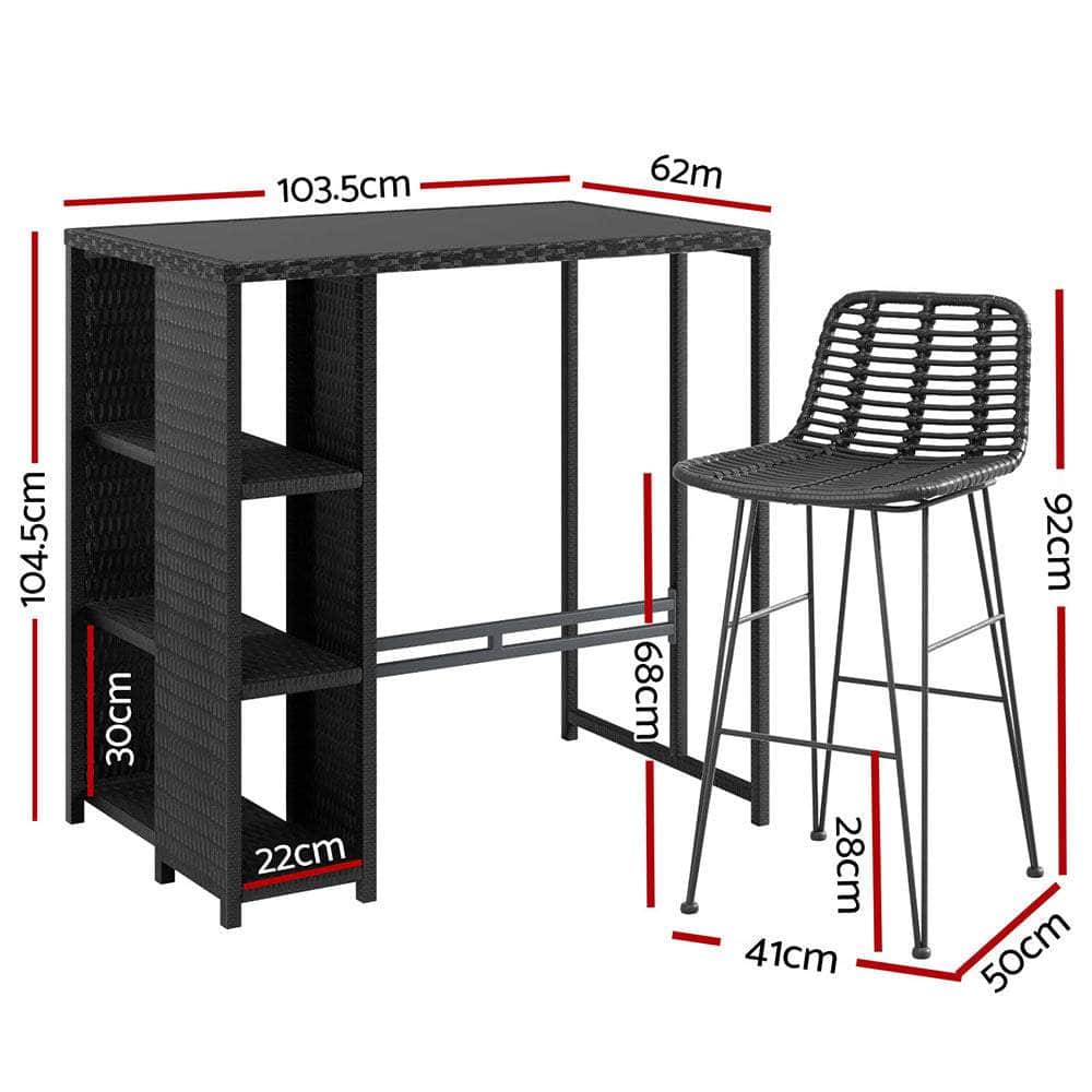 Gardeon's Outdoor Bar Set brings elegance and function to your outdoor space. The set includes a table and two bar chairs, with additional chairs available for purchase. Featuring comfortable, slanted backrests and built-in footrests, the stools provide a relaxing seating experience. Constructed with powder-coated steel and PE wicker, this set is built to withstand various weather conditions.