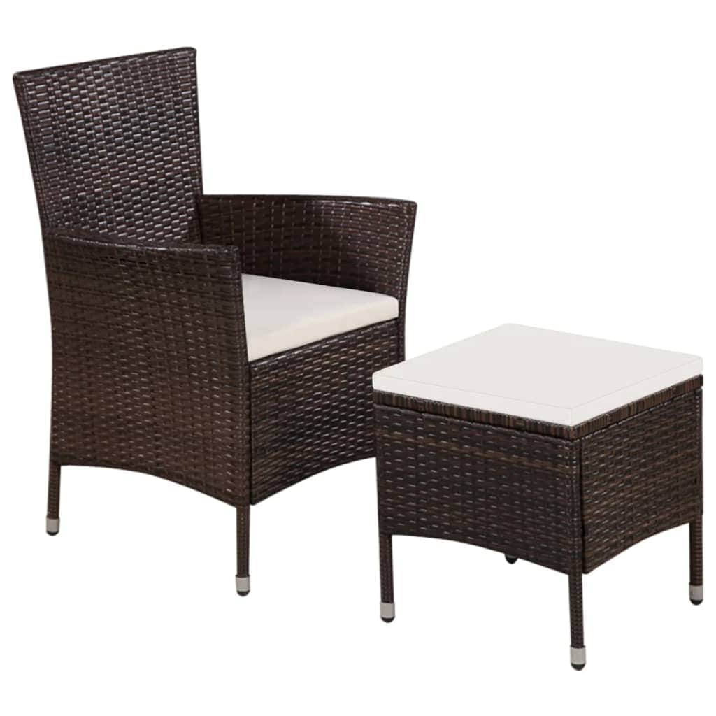 This exquisitely designed poly rattan garden furniture set consists of 1 dining chair, 1 stool and 2 removable seat cushions, and will become the focal point of your garden or patio! Thanks to the water-resistant PE rattan, this outdoor furniture set is easy to clean, hard-wearing and suitable for daily outdoor use. The steel frames make the chair and stool sturdy and stable, but since the construction is also lightweight, all items are easy to move around to suit any setting. It is also delivered with highly comfortable, thickly-padded seat cushions for the ultimate comfort. The low-maintenance polyester covers can also be removed and washed. Delivery includes 1 dining chair, 1 stool and 2 removable seat cushions. Note: We recommend covering the set in the rain, snow and frost.