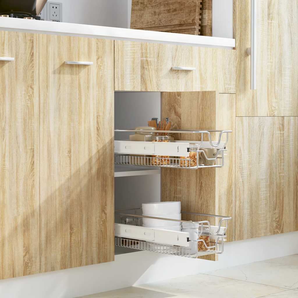 Optimise the storage space in your kitchen with these easy-to-install and durable metal basket drawers. They will make versatile additions to your kitchen cabinets. Thanks to the fully extendable runners with ball bearings, these sliding wire baskets open and close smoothly. They are suitable for 30 cm wide cabinets or cupboards and have a maximum load capacity of 25 kg for each. Made of polished chrome-plated steel wire, these kitchen baskets are rust resistant, sturdy and durable. They are also removable for easy cleaning. Assembly is really easy. Delivery includes 2 wire baskets, 2 pairs of runners and mounting accessories.