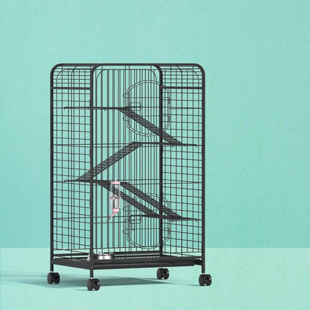 With plenty of room to roam and jump around, the Pet Cage is a wonderful activity centre for your pets. With 4 levels, multiple platforms and removable activity ladders, the cage will keep your pets entertained and provide an exceptional home for your pets. The cage is constructed with a heavy-duty black steel frame that is powder-coated for rust resistance and durability. The bottom tray slides out for easy and convenient cleaning, while 2 large access doors make feeding a breeze. Locks help keep your pets secure inside and prevent visits from unwanted predators. Not least, the four smooth castor wheels enable the entire unit to be wheeled to any location hassle-free. Give your little furry friends a home that they will appreciate in their own natural instinctive way with the Pet Cage.