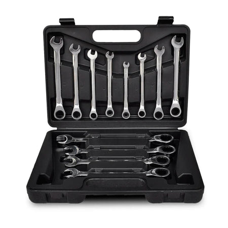 These sturdy spanners are versatile for DIY jobs and for repairing cars. They can make your work a lot easier when you are trying to repair hard-to-reach area, or when the conventional wrenches don't fit.The wrenches have a 5° return angle and 12 teeth for fine toothing on each end.Sizes available: 19 mm, 17 mm, 15 mm, 14 mm, 13 mm, 12 mm, 11 mm, 10 mm, 9 mm, 8 mm, 7 mm, and 6 mmThe wrenches have polished chrome surface for maximum rust and corrosion protection. They all come in a hard carry case for easy transportation.