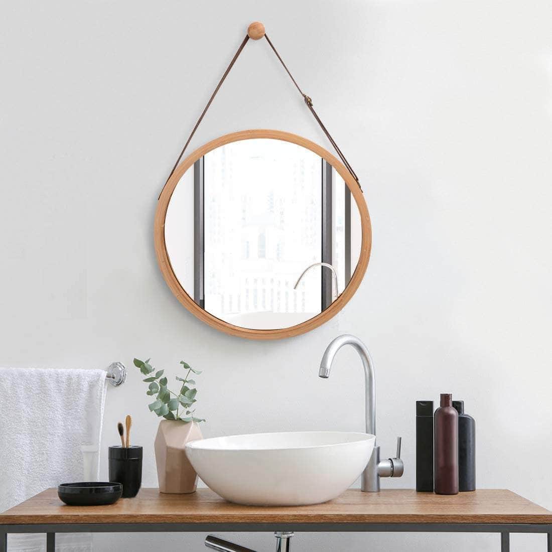 1 x Hanging Round Wall Mirror 38cm - Solid Bamboo Frame and Adjustable Leather Strap for Bathroom and Bedroom