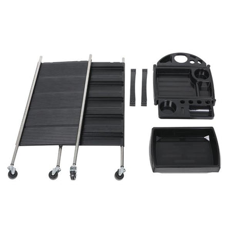 DESCRIPTIONGet convenience at hands, organize a perfect salon with our Salon Trolley. A sleeker design embedded with excellent practicality. It’s perfectly aligned compartments make your task more accessible and extra simple. Detailed structured rack that can accommodate all your stuff such as brushes, bottles, creams, sprays, hairdryers, and many more. Organize your immediate needs, sort all the tools in its spacious top - Dive into nitty-gritty details, execute a fabulous job without any worry of misplacement. It comprises of collapsible trays for those moments when you want to have more room combined with more space. Freely slide it around your workplace with its 360° rotatable wear-resistant universal caster wheel. Truly flexible, superbly practical.
