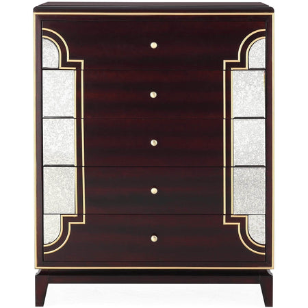 A gorgeous tallboy completes the bedroom. It not only solves the storage space problem but also looks beautiful in the bedroom. Embellish your bedroom with this Art Decor inspired tallboy. Designed in the traditional style, its shape, and colour give a relaxing feel to your bedroom. Its colours make an elegant light-reflecting statement. The immensely beautiful tallboy has 5sizable drawers. All the drawers have full-extension metal runners, beautiful knobs, and are lined in black felt for an added touch of luxury. The drawers also have a brushed brass-look finish to coordinate with the hand-painted gold trim, adding to their aesthetic appeal. The tallboy is made of solid timber: Cherry Veneer, Birch MDF, harvested in a sustainable way. The wood combination provides it with great strength and resilience. The MDF wood is resilient to moisture damage. The sleek and fully assembled tallboy goes with a variety of interior decor styles and comes with a one-year warranty.