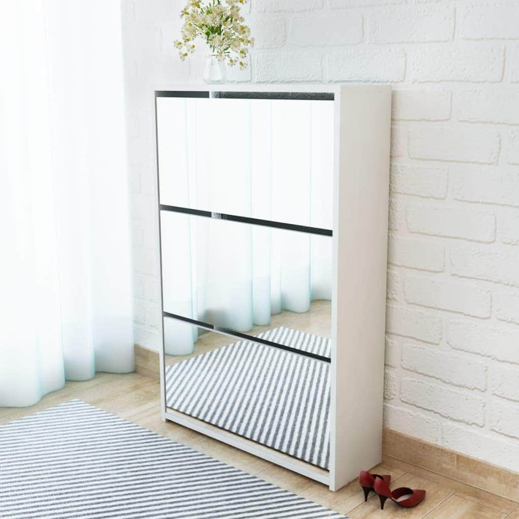 This modern, stylish mirrored shoe cabinet provides a perfect solution of keeping your room out of shoe clutter. The mirrored shoe organiser has three pull-down drawers, each of which can accommodate 3 to 4 pairs of shoes. The shoe rack is mounted directly to the wall. This strong and durable hall cabinet is made of high-quality material, making a highly practical place for neatly storing your shoes in style and clutter-free.