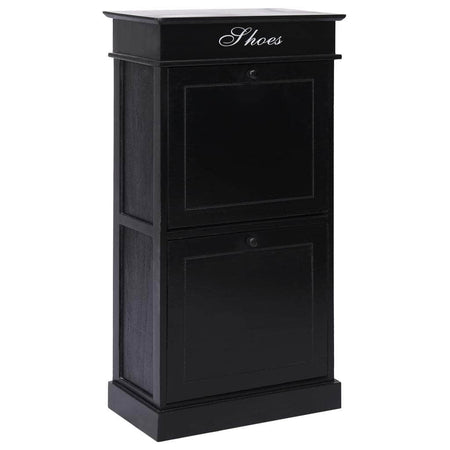 Our timeless wooden shoe cabinet presents an ideal shoe storage solution for your bedroom or hallway. You will no longer be annoyed by shoes cluttering your floor. The 2 large tilting compartments have cross bars to keep things well-organised, enabling the shoe rack to store the shoes in such a pleasurable way that you can conveniently see and remove them. Up to 10 pairs of shoes can be stored dust-free. Additionally, the cabinet top can be opened, and you can use the upper compartment to store shoe accessories such as shoelaces, shoe-pads, as well as other small belongings. Made of paulownia wood and MDF, our shoe cabinet is easy to assemble.