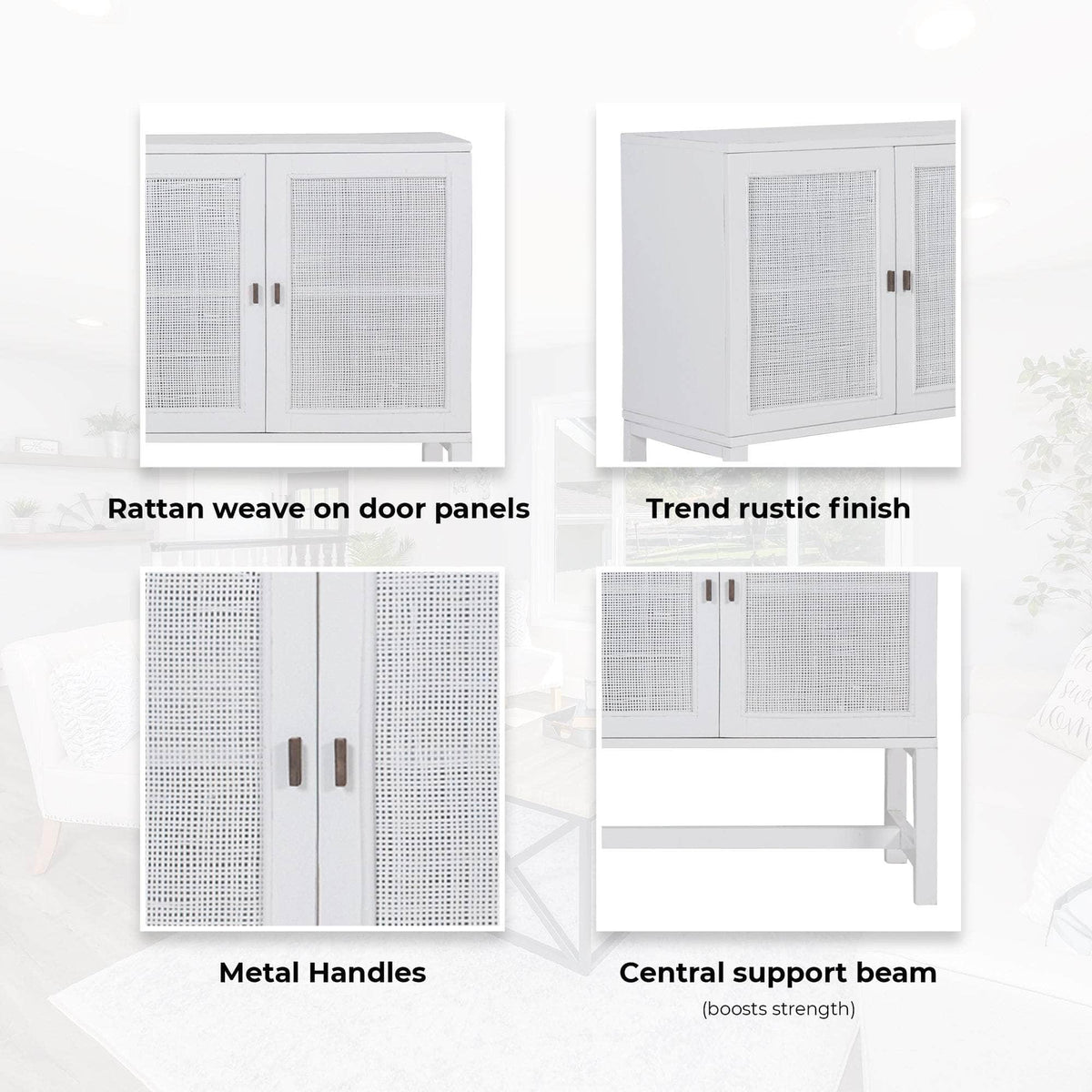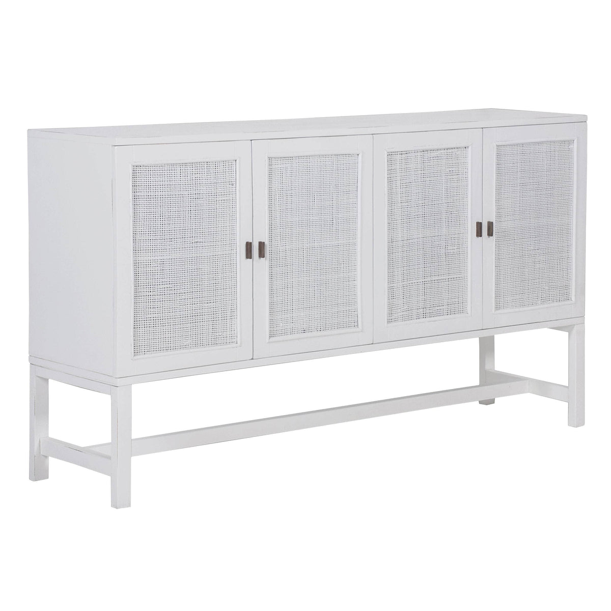 With this buffet with ethnic charm, you may say goodbye to a shortage of storage space in your living room. The buffet would greatly enhance storage space because it has 4 doors and plenty of shelf space (2 removable shelves and 8 compartments). Made of sustainably harvested solid Mindi wood, this is a classy storage unit with webbing on the front part. The Mindi wood is valued for its strength, durability, and resistance to decay due to mould or moisture. This roomy buffet, designed in a Bohemian style, with fibrous whiskers, bumps, slight cracks etc. as natural features, provides your living area with the value of convenience. Its distressed white finish allows it to blend nicely with a variety of interior decor trends. The fully assembled buffet comes with a one-year warranty.