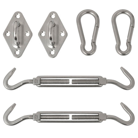 With our sunshade sail mounting kit, consisting of 2 carabiner hooks, 2 wall mounts and 2 adjustable turnbuckles, you can easily fix your square sunshade sail to any structure, tree or post. Made of high-quality stainless steel (316), this durable hardware kit will keep your sunshade sail securely in place all summer long, whatever the weather conditions are.