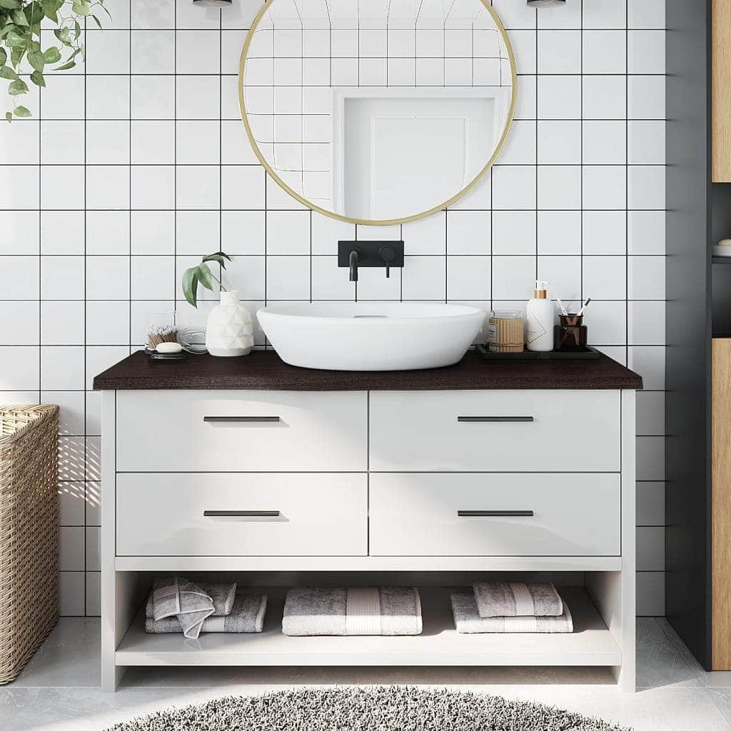 Are you planning to renovate your countertops at home? This wooden bathroom countertop is a perfect choice! Durable construction: This bathroom worktop is made of solid oak wood, which is a beautiful natural material. Oak wood has a medium brown colour and a dense grain, contributing to its unique look.Versatile applications: Besides a bathroom vanity top, this wooden countertop can be combined with different bases according to your needs. It can be used as a shelf, cabinet top, desk top, table top etc.Treated surface: The bathroom top has been treated with dark paint, so it is ready for use as an additional finish is not required.Handmade with live edge: This bathroom vanity countertop is handmade with a live edge. Due to that the knots, cracks, slightly curved shapes, and colour tones are part of the oak wood, every piece of oak countertop has its own unique character to display. The delivery is random. Good to know:As a natural product, wood may show knots and imperfections that we fill with black fillings to ensure a smooth appearance.