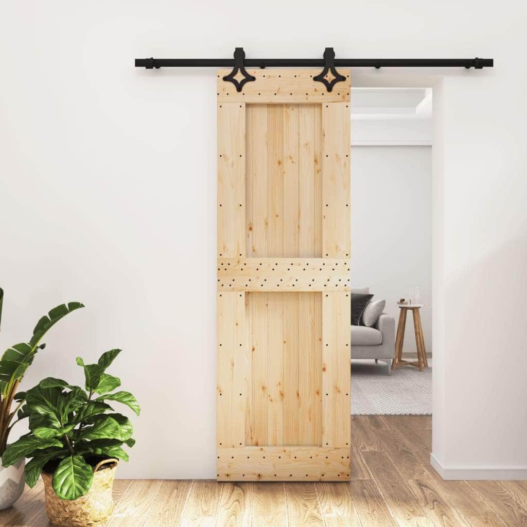 This solid pine wood sliding door is designed to enrich the entrance area of your house and also ensure better security for your home. Solid pine wood: The interior door is made of solid pine wood. Solid pine wood is a beautiful natural material. Pine wood has a straight grain, and the knots give the material its signature, rustic look.Sturdy sliding rails: Steel is an exceptionally hard and strong material. It offers sturdiness and stability. The powder coating on steel creates a protective layer against wear and tear. Made of powder-coated steel, the sliding rails are sturdy, durable and heavy-duty.Quiet and smooth sliding: Thanks to the internal bearings, your internal sliding door will slide smoothly and quietly. Doorstops are also included to prevent the derailing of the rollers, while the rubber gaskets will buffer the bump from rollers and reduce the noise.Space-saving design: This wooden sliding door saves space and looks more spacious. It is the first choice for a simple and atmospheric modern home design.Wide applications: The sliding barn door can be installed on both wooden walls and concrete walls. It's great for use in the bedroom, kitchen, barn, garage, etc.