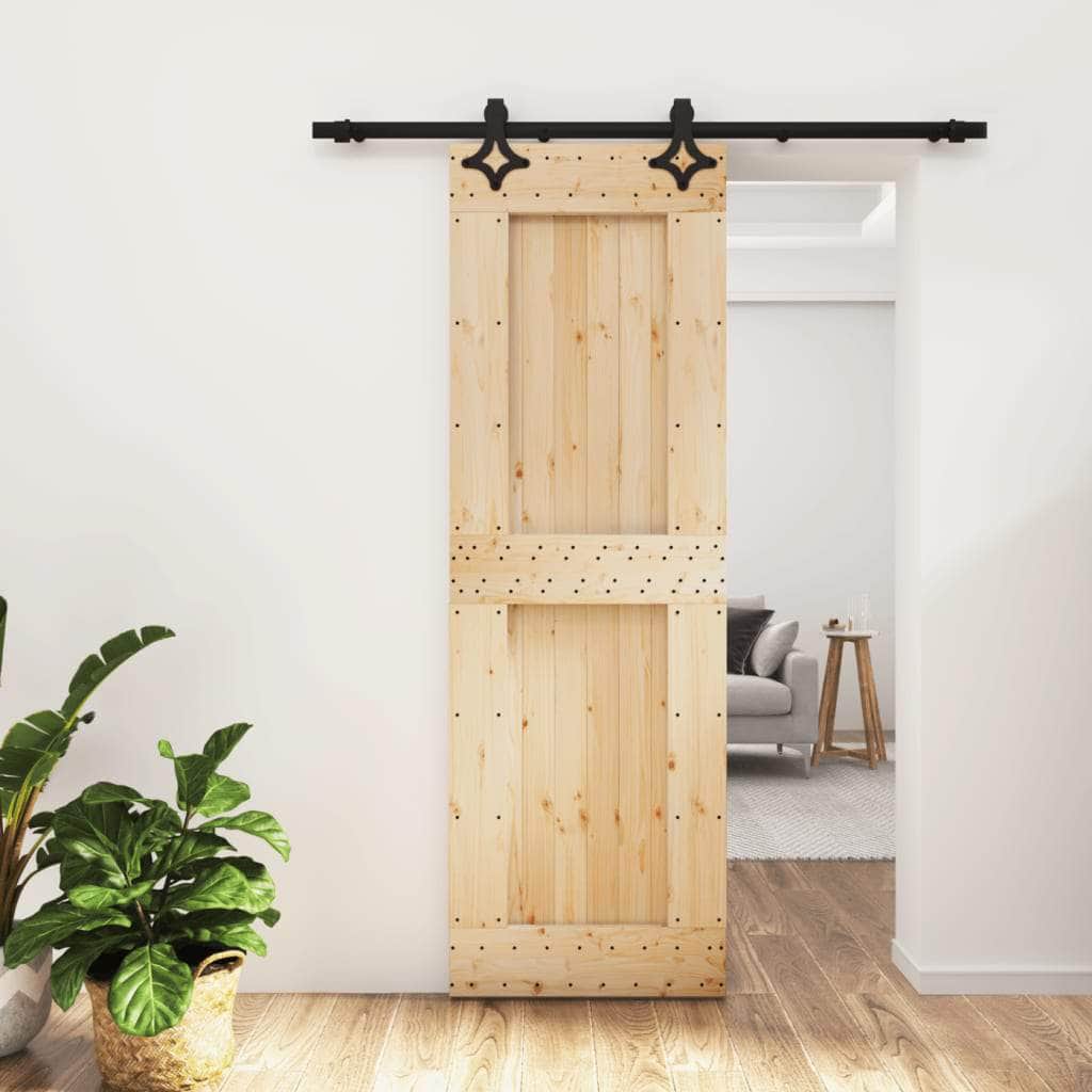 This solid pine wood sliding door is designed to enrich the entrance area of your house and also ensure better security for your home. Solid pine wood: The interior door is made of solid pine wood. Solid pine wood is a beautiful natural material. Pine wood has a straight grain, and the knots give the material its signature, rustic look.Sturdy sliding rails: Steel is an exceptionally hard and strong material. It offers sturdiness and stability. The powder coating on steel creates a protective layer against wear and tear. Made of powder-coated steel, the sliding rails are sturdy, durable and heavy-duty.Quiet and smooth sliding: Thanks to the internal bearings, your internal sliding door will slide smoothly and quietly. Doorstops are also included to prevent the derailing of the rollers, while the rubber gaskets will buffer the bump from rollers and reduce the noise.Space-saving design: This wooden sliding door saves space and looks more spacious. It is the first choice for a simple and atmospheric modern home design.Wide applications: The sliding barn door can be installed on both wooden walls and concrete walls. It's great for use in the bedroom, kitchen, barn, garage, etc.