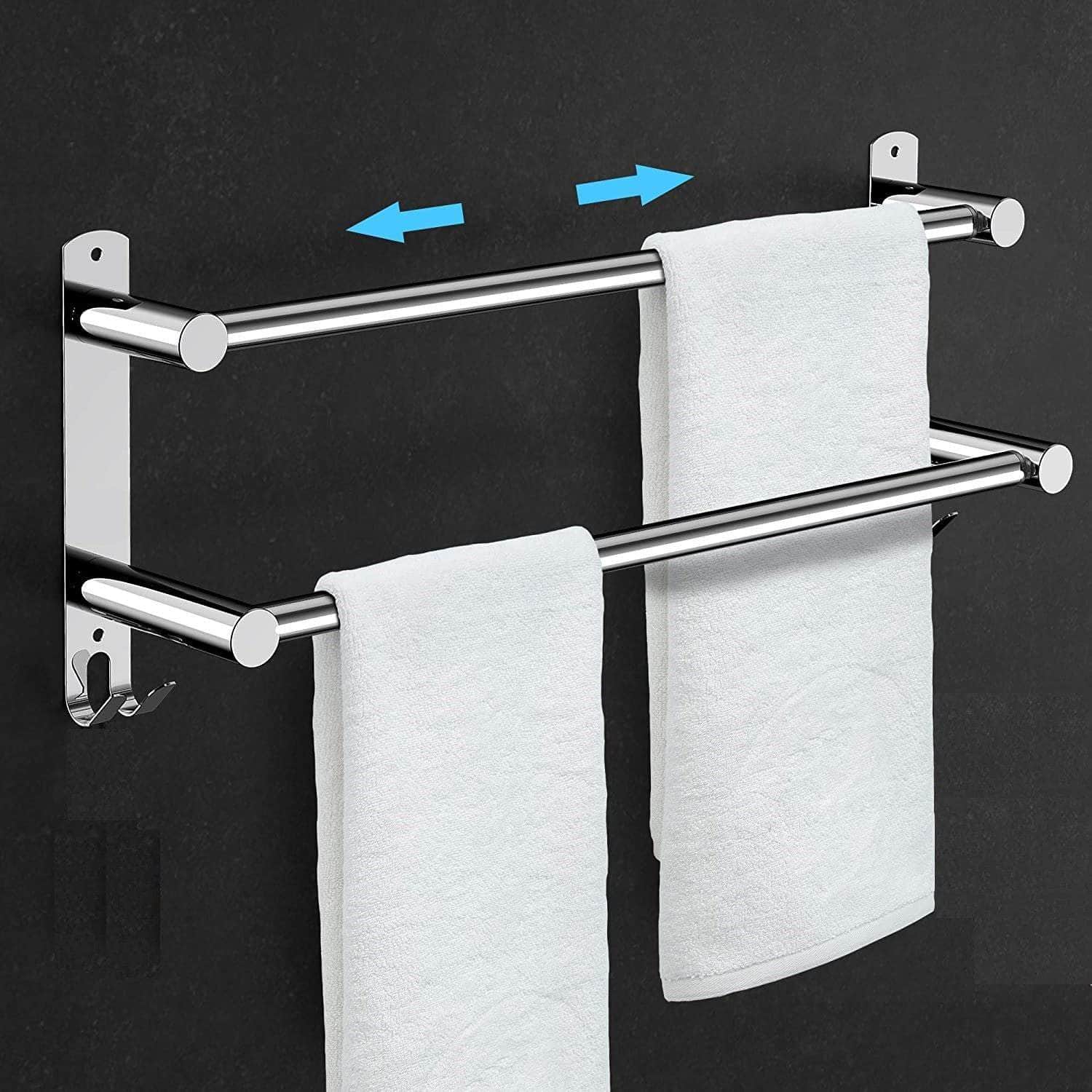 - Adjustable towel bar: This towel rail can expand to fit your exact needs(Stretchable 45-75 cm). The maximum length extends to 89 cm, can hang all size of towels, perfect for 4 hand towels or 2 extra large bath towels, no folded or bunched bath towel any more. The minimum length is about 50 cm, fits narrow space using.