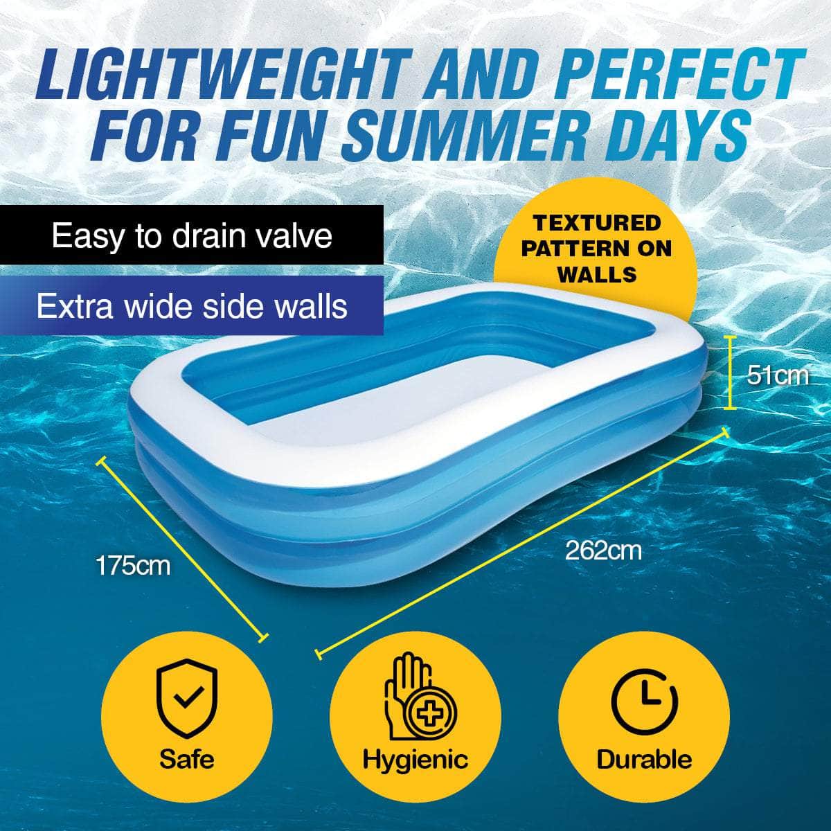 Perfect to use during the summer months is this amazing Inflatable Family Pool! Holding a mega 778 Litres, this pool is made of high quality, pre-tested PVC that retains its shape at all times. Enjoy having this pool to splash, swim, and play in on those warm days and create summer fun memories.