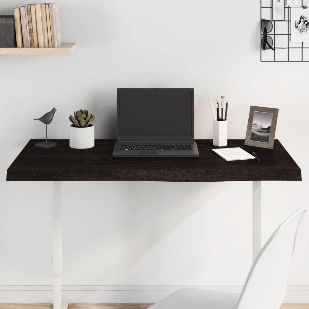 Give a new life to your table with this wooden table top. It is an excellent solution for freshening up your table at home or in a commercial setting. Solid oak wood: The tabletop is made of solid oak wood, which is a beautiful natural material. Oak wood has a medium brown colour and a dense grain, contributing to its unique look.Versatile applications: The replacement table top can be combined with different bases according to your needs.Treated surface: The replacement board has been treated with dark paint, so it is ready for use as an additional finish is not required.Handmade with live edge: The DIY board is meticulously handcrafted, showcasing a live edge that adds to its natural charm. Every piece of shelf has its own unique character to display. The delivery is random, ensuring the exclusivity and individuality of your product. Good to know:As a natural product, wood may show knots and imperfections that we fill with black fillings to ensure a smooth appearance.