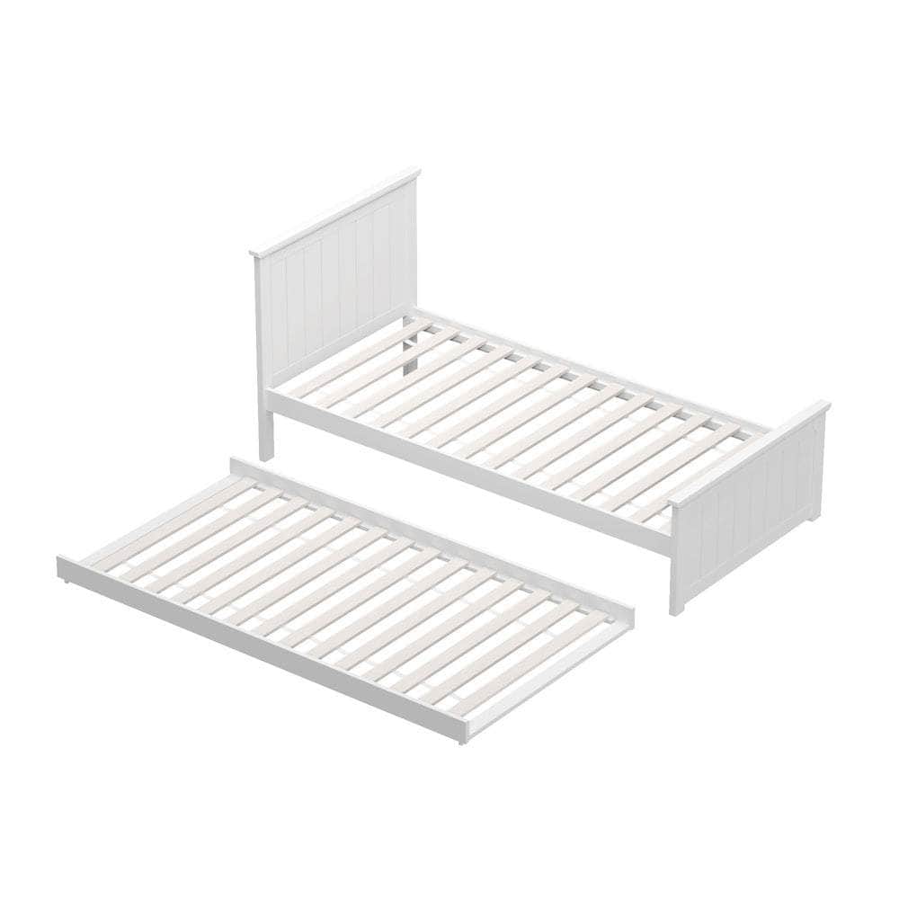 The contemporary coastal-inspired styling adds a pleasant touch to any bedroom décor. Plus, a large headboard and substantial end board gives an integrated look to this trundle bed. Underneath, the trundle bed frame can accommodate a mattress up to 14cm thick for ample sleeping comfort. Just roll out the trundle bed on the smooth wheels and roll back in when done. An instant second bed. No hassles. Easy does it.