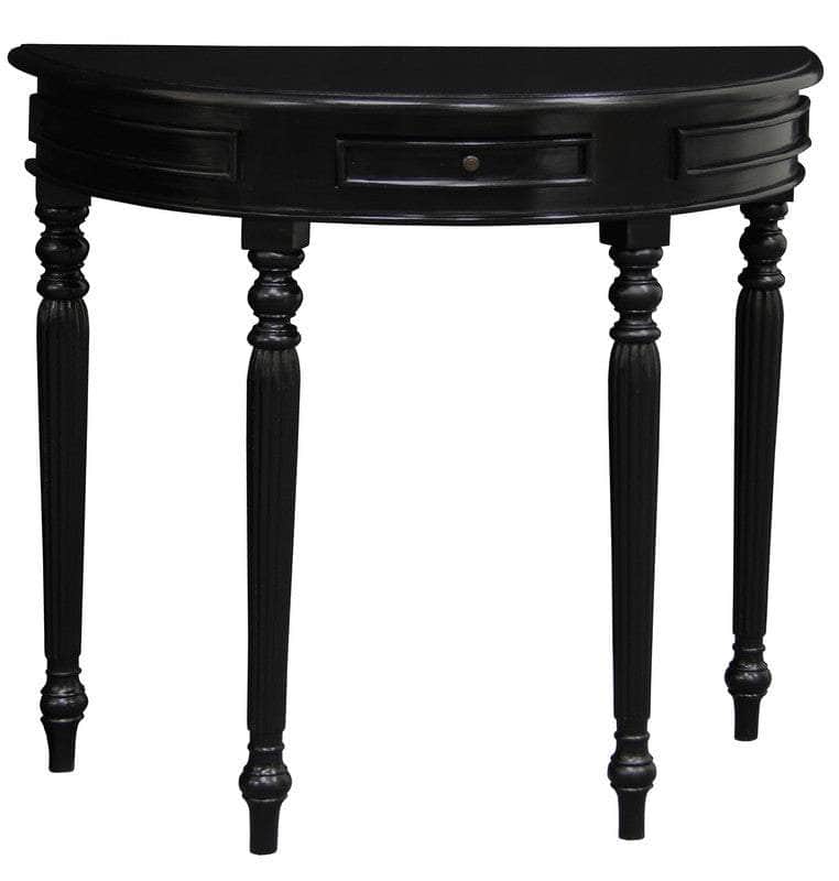 The Huntley Turn Leg Half Round Sofa Table, now in solid mahogany timber, brings a sumptuous feel to any room. The black finish adds a bold statement, while the mahogany and white variations provide a classic look, offering you the freedom to choose the perfect match for your decor. This table's turned legs and half-round design present a graceful silhouette, complemented by the sturdy and timeless appeal of mahogany.