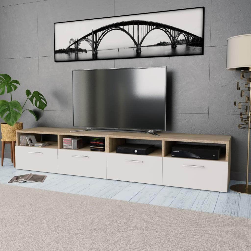 The modern TV cabinets have an understated, functional design that will suit any home decor. The HiFi cabinets are made of engineered wood with PVC edges and are stable and durable. Each has two open shelves and two cabinets with downwards-opening doors that have ample storage space for your DVD player, gaming console, digital receiver, or media carriers. The cleanly-designed TV cabinets will make a great addition to your bedroom or living room. Assembly is easy. Delivery includes 2 TV cabinets.