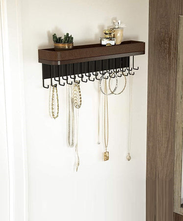 - Mounted on a wall with 25 hooks for necklaces and bracelets.