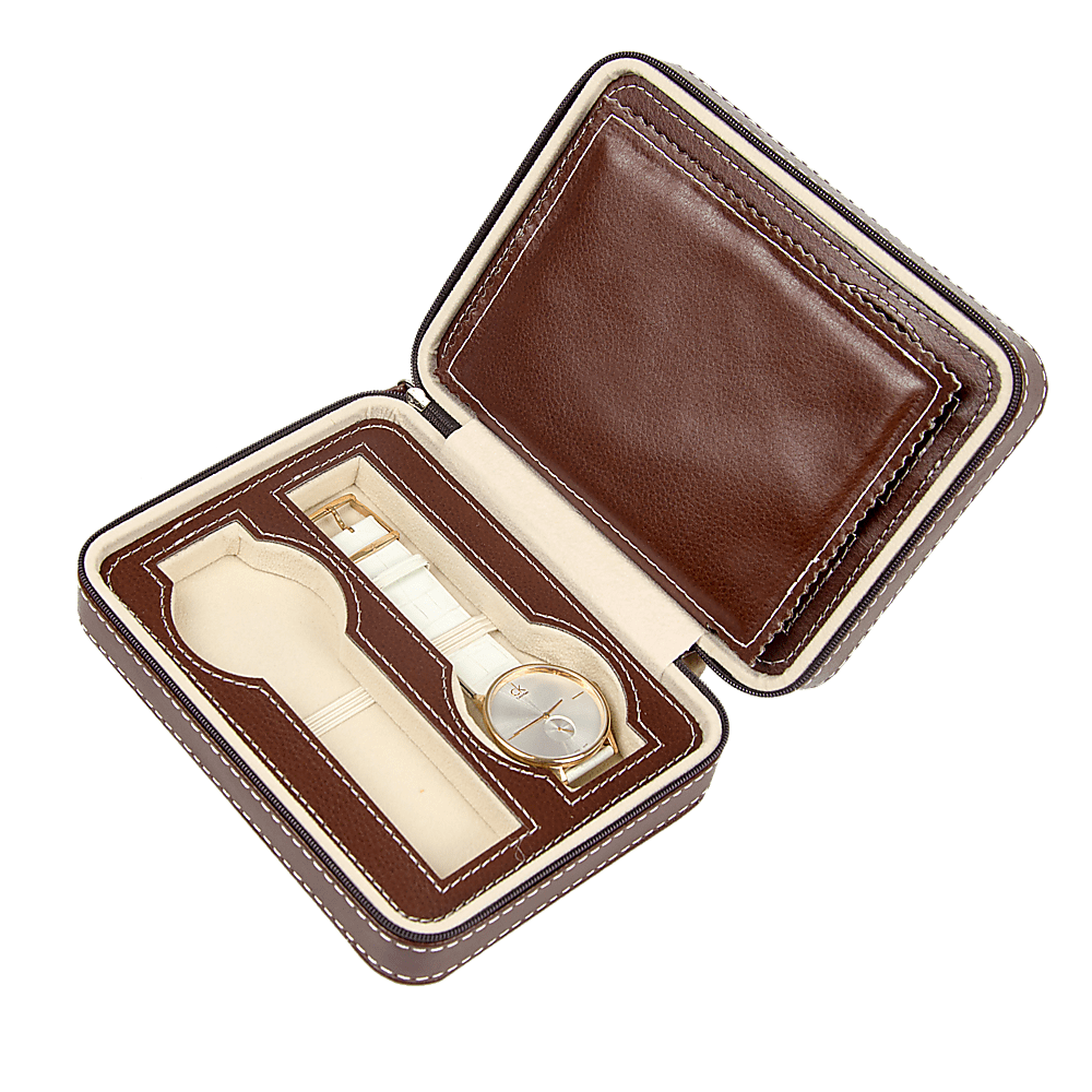 Elegant yet rugged, this gorgeous brown watch case from Randy Travis Machinery is the perfect accessory for your dresser top. With slots for four watches, it's perfect for the avid watch collector. Crafted from durable PU leather on the outside and soft velvet inside, this case will protect your valuable watches from scratches and dust. White stitching gives it a sporty look, while its neutral, yet earthy colour blends into nearly every colour palette. Left open, it showcases your watch collection off to perfection.