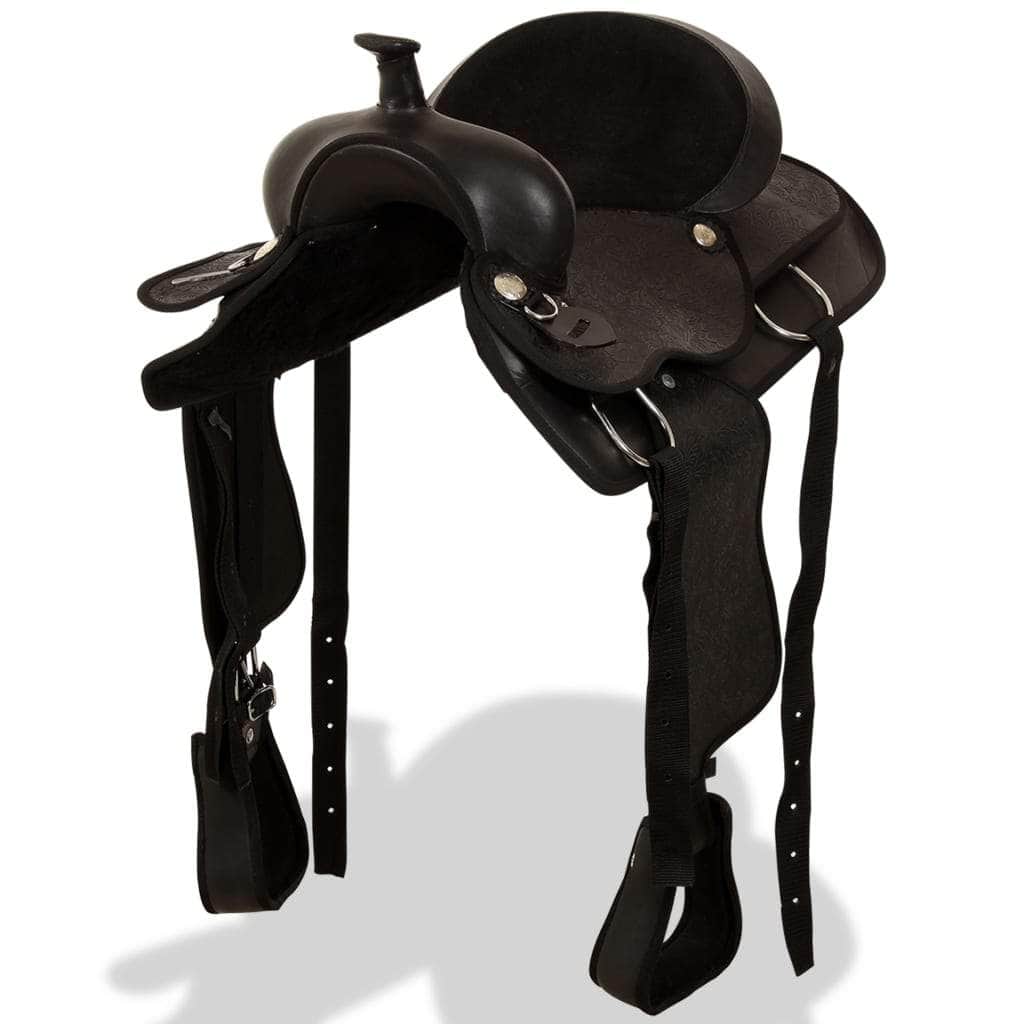 This Western saddle is delivered with a matching headstall and breast collar. The high-quality genuine leather and artificial leather that is decorated with floral embossing make the saddle decorative as well as functional. The Western saddle is reinforced at all pressure points for added durability. The leather stirrups are sturdy and hard-wearing, as are the billet and the cinch. This Western saddle is very comfortable so horse as well as rider can spend long hours out on the trail.