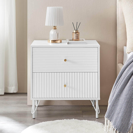 Step into a realm of unique modern luxury with the Sarantino Diego Bedside Table. Its wavy fluted design adds a touch of unique artistic flair to your bedroom, making a bold statement. The golden drawer handles provide an elegant contrast, while the white powder-coated metal base exudes contemporary charm. Practicality meets style with spacious drawers for seamless organisation. Supported by sturdy metal legs, this piece provides a strong foundation. Elevate your sleeping space with the Diego Bedside Table.