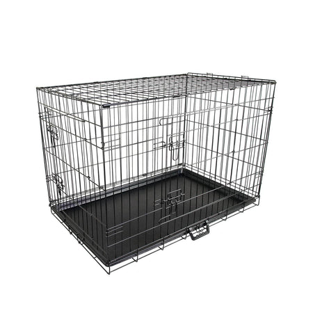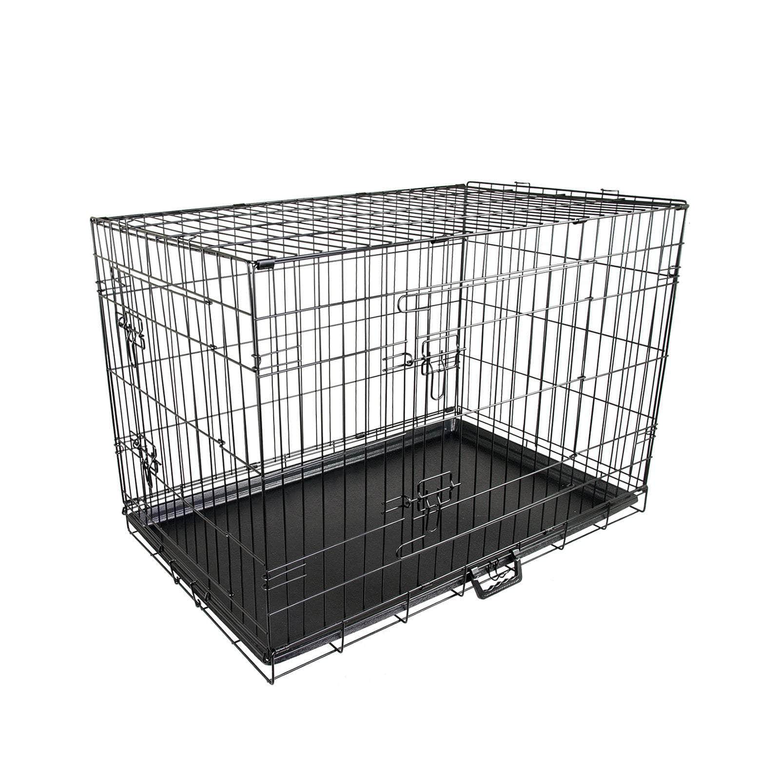 This convenient wire dog crate feature double access doors that provide easy access for your dog to easily enter and exit, as well as dual safety locks on each door to keep your pup securely inside. Built with quality sturdy wire construction with black powder-coated finish. The slide-out / removable plastic tray for easy cleaning.