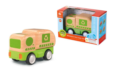 Unleash a world of construction fun with the Wooden Friction Work Recycling Truck from . This rugged little recycling truck, crafted from eco friendly wood with vibrant green detailing and plastic components, is ready to roll into action. Powered by friction, it zooms across the floor with a mighty vroom that makes playtime come alive. But that s not all, press down on the recycling truck, and you will hear three exciting sounds: the roar of the engine starting up, a cheerful horn beep, and the beep beep of the truck reversing. Plus, the headlights light up for extra fun.